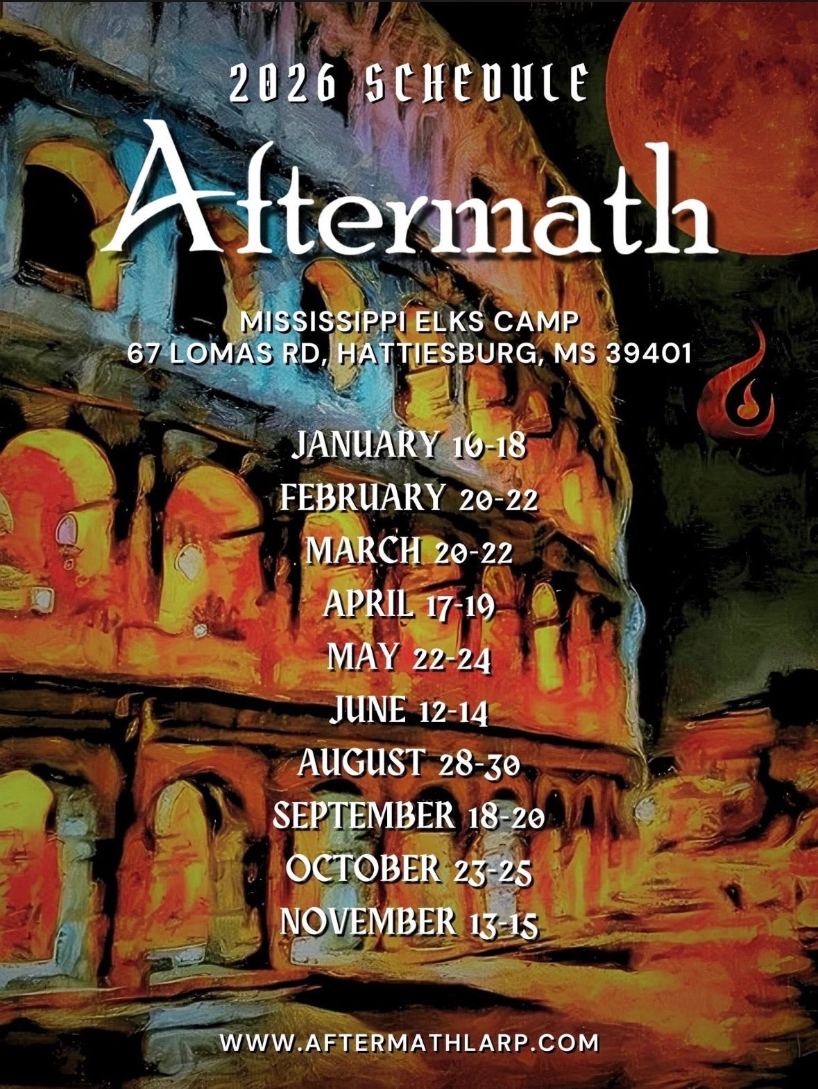 Games are held monthly and typically run from Friday at 11 PM to Sunday at 2 PM. First-time players attend free. Come prepared to immerse yourself in a weekend of story, survival, and roleplay.
